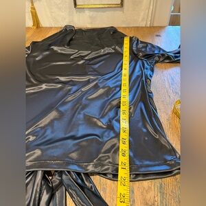 Haut noir élégant signé Sarah Pacini. Encolure drapée fluide et ceinture assortie à nouer à la taille pour une silhouette féminine et raffinée. Fini lustré et moderne, idéal pour une soirée ou un style contemporain chic.