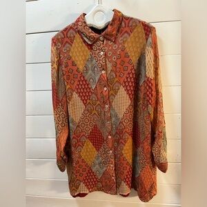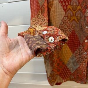 Beautiful Sarah Pacini blouse featuring a stunning patchwork print in warm earth tones — shades of terracotta, mustard, and soft beige. Lightweight and fluid viscose with full button front and classic collar. A refined bohemian piece that combines comfort and sophistication.