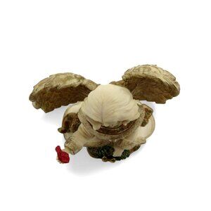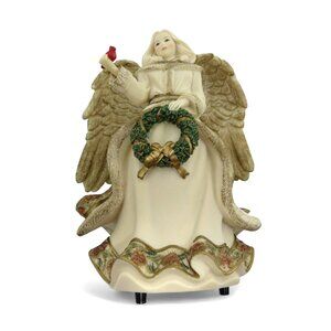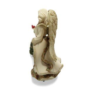 This exquisite angel figurine, crafted by Mindspring Studio, features a serene angel holding a festive wreath and a delicate red bird.
