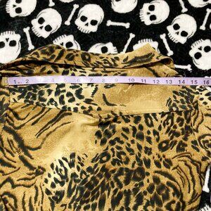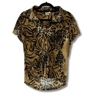 🎩 Style tags: EUC, cheetah, blouse, button-down, button-front, retro, vintage,1940s, 1950s, 1960s, 1980s, pinup, pin-up girl, trendy, mobwife, brown, yellow, gold, rockabilly, gothabilly, goth, gothic, gothcore, e-girl, scene, rave, raver, edgy, alt, alternative, biker, bikercore, glam rocker, rock and roll, grunge, indie sleeze, ruched, v-neck, t-shirt, tee, fitted, bodycon, party, clubwear, clubbing, holiday, spring, summer, fall, autumn, Halloween, Flintstones, Wilma Flintstone costume, cavewoman costume, safari, jungle, feminine, sexy, hot, fun, festival, bohemian, & boho