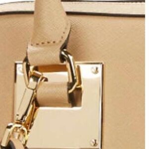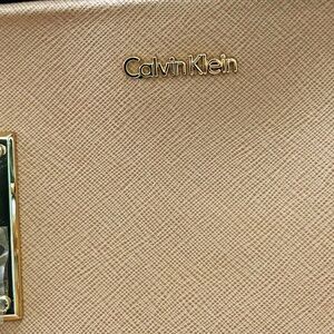 SATCHEL, CALVIN KLEIN IN SAFFIANO LEATHER, CREAM, TWO HANDLES & SHOULDER STRAP, TOP ZIPPER TO ¾ DOWN EACH SIDE, OPENS WIDE, GOLD TONE HARDWARE, INSIDE POCKETS, NAME OF BAG: EMMA, NEW NEVER USED, NO DAMAGE
