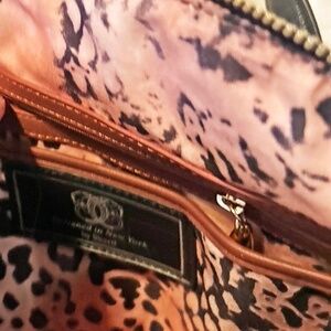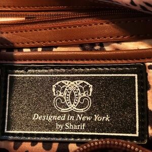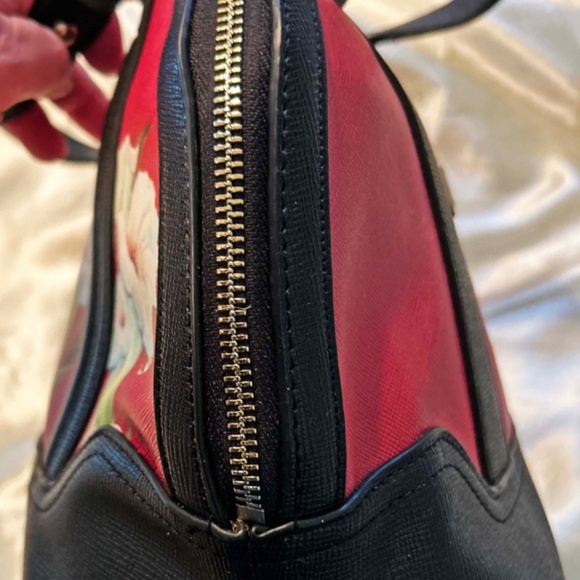 SATCHEL, LEATHER, DUSTY PINK WHITE & BLACK MULTICOLOUR FLORAL, TOP ZIP CLOSURE, DOUBLE LEATHER HANDLES, REMOVABLE/ADJUSTABLE BUCKLE CROSSBODY STRAP, DOME SHAPE, SLEEPER BAG, by SHARIF, TAGS ON, NEW NEVER USED, NO DAMAGE
