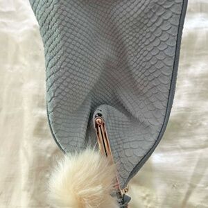 ACCENTS: Embossed python suede on each side. Gold tone hardware. Faux fur pom-pom and a tassel with signature gold ring.