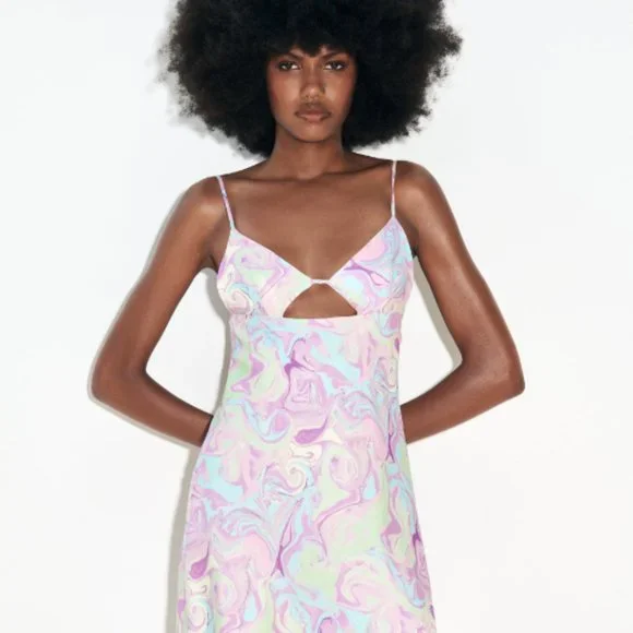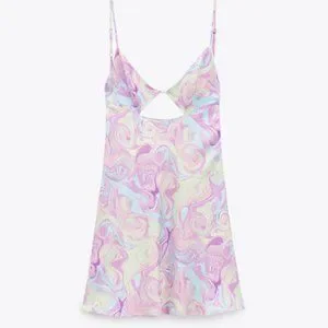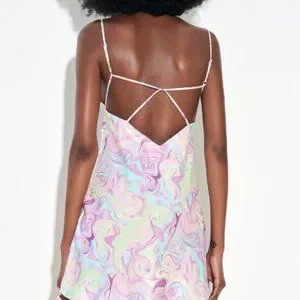 Multicoloured Satin Mini Dress. Open Back. Spaghetti Straps.