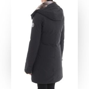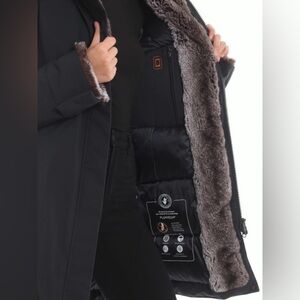 Wind and water resistant matte technical fabric padded coat featuring faux fur lined removable hood, concealed zip and snap closure, two front zipped pockets and an inner one, faux fur lined cuffs and fastening. Extremely Warm: -20°/-5° C.