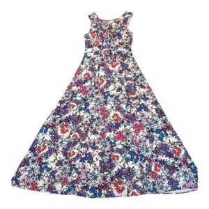 Get ready to turn heads in this gorgeous floral print maxi dress! The vibrant pattern of watercolor flowers in blue, red, and white is perfect for any occasion, from a casual brunch to a special event.