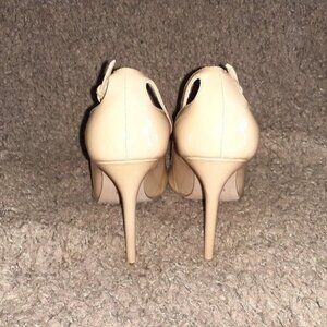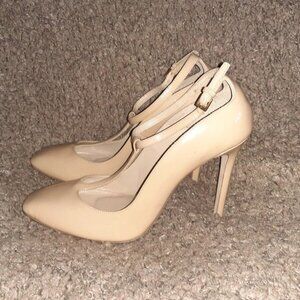 Beige patent leather stiletto t-strap with ankle strap with buckle.