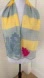 Oblong scarf with wide light blue and yellow stripes. Bright pink oak leaf on one end and floral design on the other. Small sun in one corner. Unsigned. No material tag, but I think this is silk.
