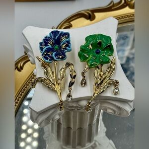These asymmetric earrings are made of beautiful gilded brass and hand-painted enamel, fashioned into asymmetric pansies in blue and green. The flowers are gilded with gold touches, and the flowers' golden stems and leaves are finished with hanging teardrop crystals.