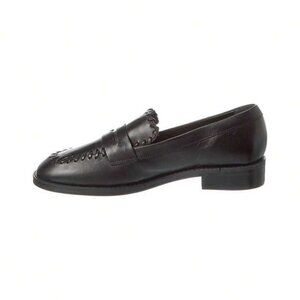 SCHUTZ Lenon Leather Flat. This sleek and sophisticated slip-on style features a chic black leather upper with a man tailored design. The moderately padded footbed and smooth leather sole provide all-day comfort, while the 1.2-inch heel adds a touch of elevation. Perfect for work or play, these flats are versatile and timeless. Imported with high attention to detail, this SCHUTZ Lenon Leather Flat is a must-have addition to your shoe collection. Sleek black loafers with stitched detailing. Comfortable and stylish. Perfect for everyday wear.