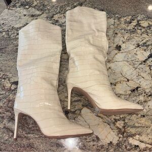 SCHUTZ Cream Heeled Boots with Croc-Embossed Texture