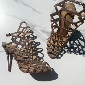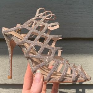 These are seriously a gem..😍 Glitter-coated leather styles a chic cutout sandal set on a slim, wrapped heel.