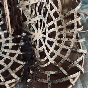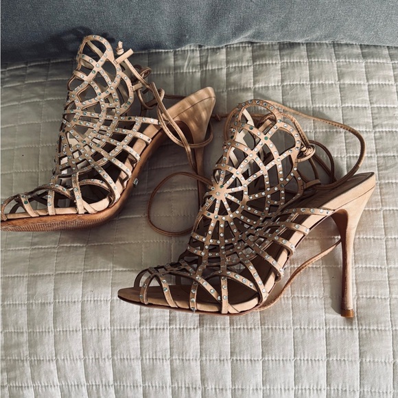 Chic leather tan designer heels with intricate strappy design. Adorned with sparkling rhinestones. Ideal for elevating any outfit. Ties up the ankle. Branding on bottom and sole.