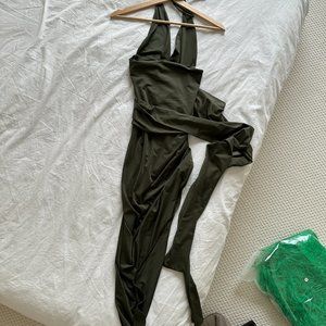 Backless with ultra high side slit, stretch material with wrap piece in khaki colour
