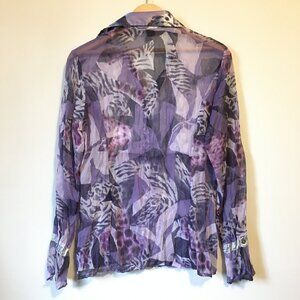 Very good preowned condition rare SE Stenau designer shirt, featuring abstract, eclectic patterns of animal skin, flowers, washes and shapes in purple, black, white and lavender. Sports unique buttons down the front. I think 3 different kinds. Has ruffled cuffs and a unique pintuck bib of various materials. Absolutely unique. I couldn't locate a fabric tag but to me it feels like it could be silk or a silk blend. This is a high end designer from Europe (Germany I believe), so I imagine they would use good quality fabrics like authentic silk.
