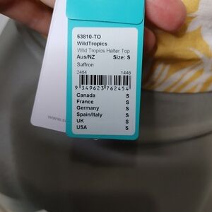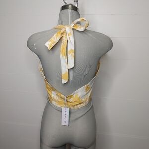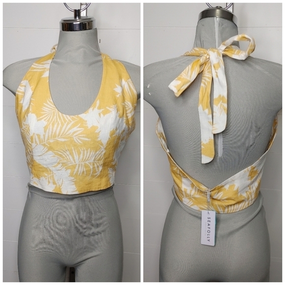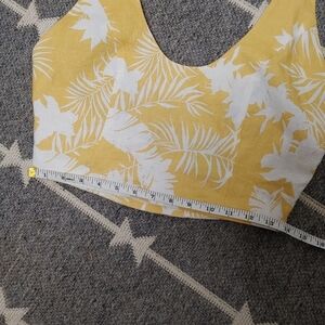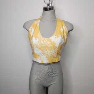 Saffron yellow tropical printed self tie halter top with partial side zip closure. Fully lined. I find this fits a little on the large side so please check measurements. Probably closer to a medium. No material tag but feels like linen. Brand new with tags.