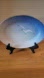 A seagull on the right side of the platter flies towards the left against a background of very gentle blue ombre effect fading to white with a textured fish scale pattern.