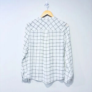 This stylish plaid blouse from Sears combines a timeless white-and-black pattern with a sheer, airy fabric. Designed with chest pockets and a relaxed silhouette, it’s perfect for layering or pairing with denim for an effortless chic look.