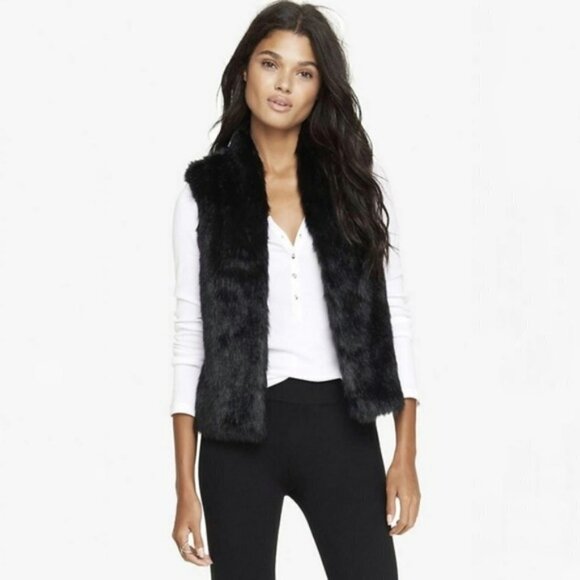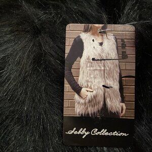 SEBBY COLLECTION Women's Vegan Black Faux Fur Vest - Size Small - NWT. Made in China. Shell front (faux fur): 67% acrylic, 17% polyester, 16% modacrylic. Shell back: 100% polyester. Lining: 100% polyester. Made in China. Two hook & eye in front. Stretch to material.