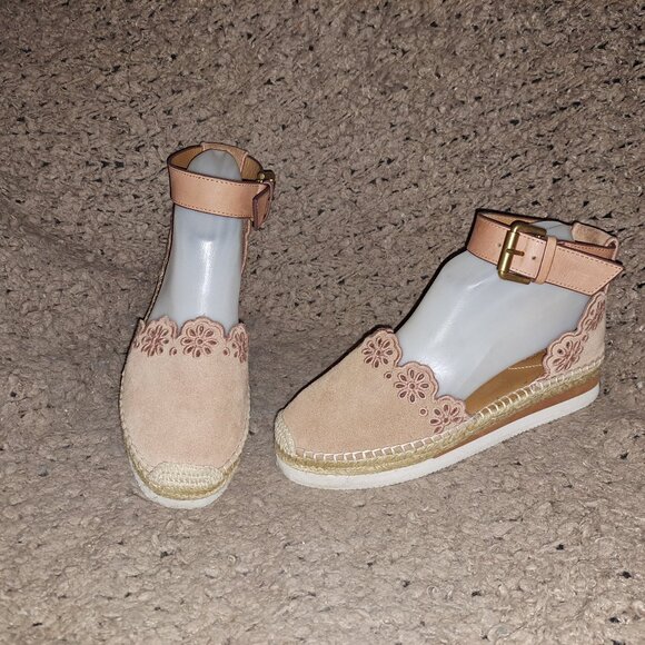 SEE BY CHLOE-Glyn-Suede Laser Cut Flower-Buckle Wedge Espadrille-SZ 37-Very Good