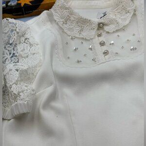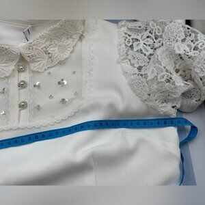 White A-line style dress from Self Portrait featuring white guipure lace bubble sleeves and collar, with an intricate bib design and beautiful pearl and crystal buttons.