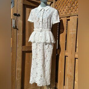🆕 SELF-PORTRAIT 🧿 NWOT White Lace Peplum Belted Midi Dress, Sz UK 12 US 8