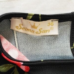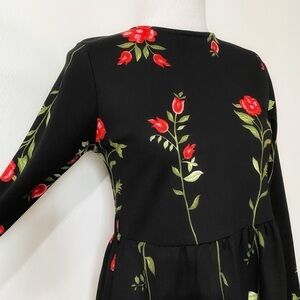 SELMA SARI BLACK RED FLORAL LONG SLEEVE MAXI DRESS, This is a vintage yet super trendy and contemporar y black long sleeve maxi dress with a red and green floral print allover - round neckline - back upper neck button closure with a keyhole style - flowy - super lightweight and unlined - slighty textured - has belt loops for a belt or a fabric waist tie add-on. Bohemian to modern pastoral / spring and summer favorite for formal yet not overdress look, can be dress up or down with ballerina flats or black heels - lance up sandals and red lipstick. Made in Turkey.