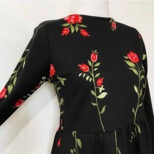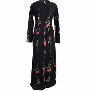 SELMA SARI BLACK RED FLORAL LONG SLEEVE MAXI DRESS, This is a vintage yet super trendy and contemporar y black long sleeve maxi dress with a red and green floral print allover - round neckline - back upper neck button closure with a keyhole style - flowy - super lightweight and unlined - slighty textured - has belt loops for a belt or a fabric waist tie add-on. Bohemian to modern pastoral / spring and summer favorite for formal yet not overdress look, can be dress up or down with ballerina flats or black heels - lance up sandals and red lipstick. Made in Turkey.