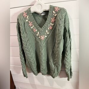 Charming vintage knit in a soft sage green with lovely floral embroidery around the V-neck. Features a chunky cable-knit design and long sleeves. A cozy, feminine piece with timeless appeal. Size 40 – refer to measurements.