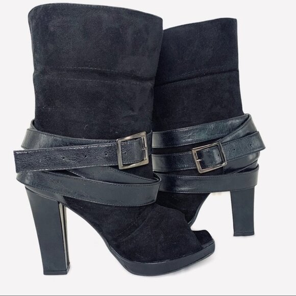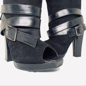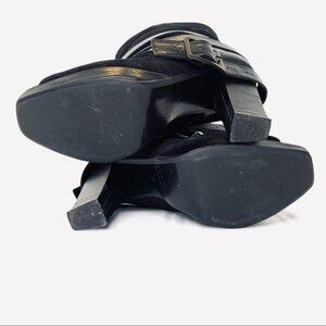 SEPALA BY MIHAELA GLAVAN BELTED THICK LEATHER SUEDE HEELED OPEN TOE BOOTS