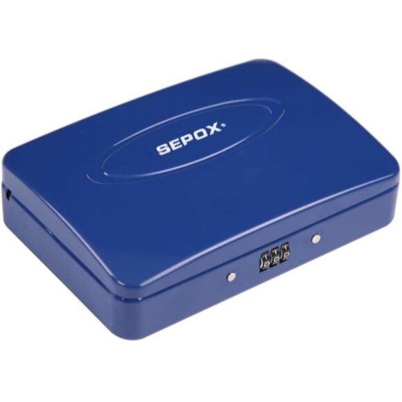 SEPOX portable security case lock box made of durable steel with high-quality zinc alloy code wheel. Features a resettable 3-dial combination lock for personalized security. Ideal for travel, home, office, or car. Includes a security cable to secure the box to a fixed object. External size approximately 8.1 x 5.7 x 1.9 inches. Weight: 23 oz (650g).