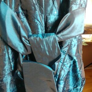 Very pretty Turquoise dress which has small sequins in the fabric. The fabric has a sheen to it. It is strapless and zippers up the back. Size 13/14 by Morgan and Co. Great for a party, wedding or special event.