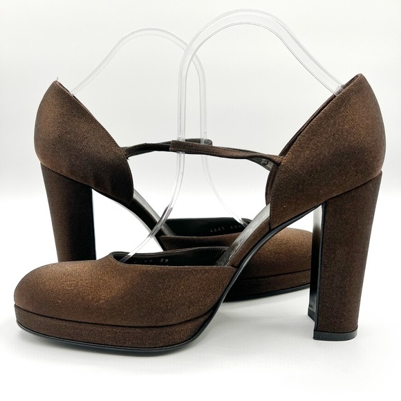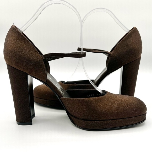 [Meta: Embrace vintage 90s nostalgia with these Sergio Rossi brown satin Mary Jane pumps, featuring chunky heels and a platform design. With their deadstock condition and rarity, these shoes are a coveted vintage find that commands respect and admiration.]