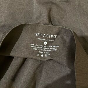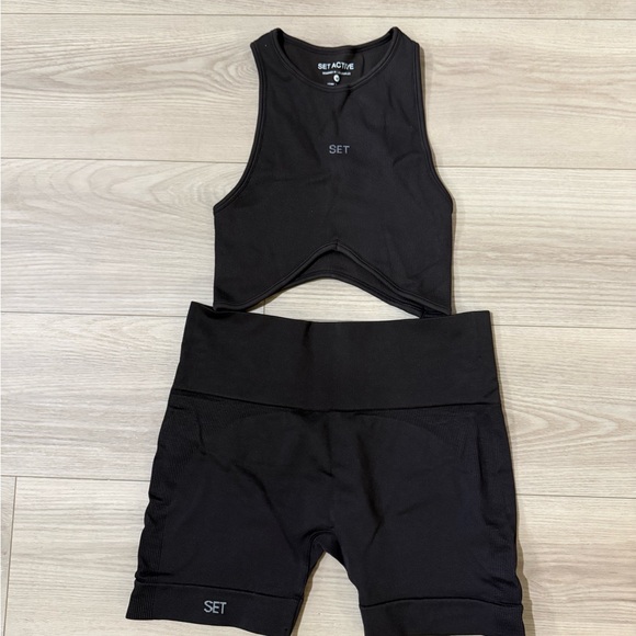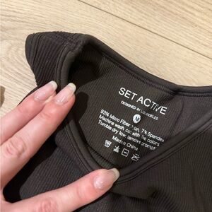 Never worn brown matching set from SET Active. Features a crop top and matching shorts. Ideal for workouts.