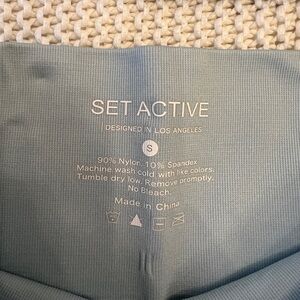 Light blue workout set from SET Active. Ribbed crop top with scoop neckline. Matching high-rise biker shorts. Seamless, stretchy performance fabric. Both size S.