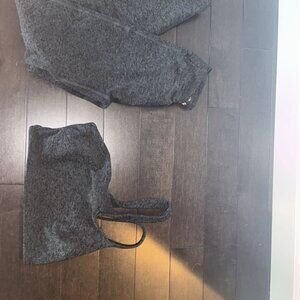 Sleek charcoal leggings and bra. Perfect for workouts. Comfortable fit.