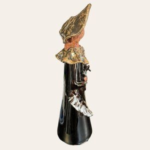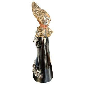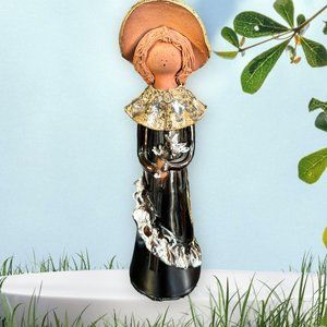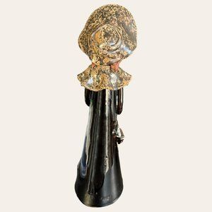 Girl in Dark brown-black-reddish/White and Brown ruffled dress, w/ Spaghetti Hair and large brimmed summer hat holding her floral - glaze finish. Measures 13" tall.