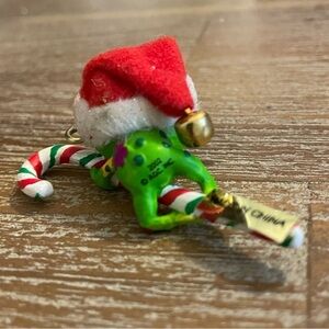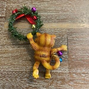 SET of 2 AGC Christmas Ornaments. (Hanging wreath cat and candy-cane frog)