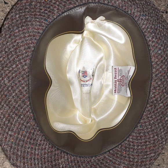 This Stetson Harris Tweed fedora hat in size 7 3/8 is made of 100% handwoven Scottish wool in a striking red, purple, and gray color combination.