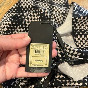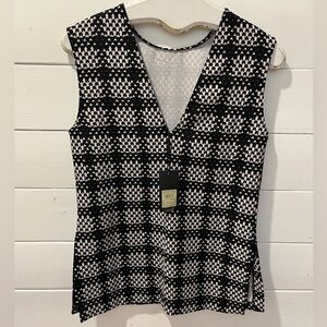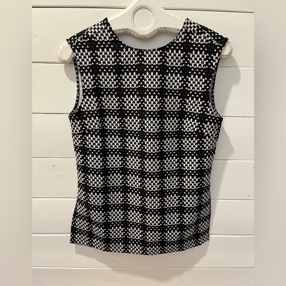 Bold and structured, this sleeveless top features a black and white geometric print with subtle texture. Slightly fitted cut with a bateau neckline at the front and a deep V-neckline at the back. Elegant side slits and a lightweight feel. Brand new with original tag (original price: