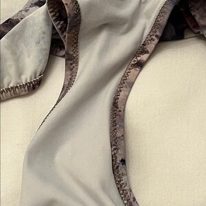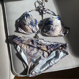 SHAN bikini with gray taupe multicolor pattern. Halter top. Comfortable, chic design. Top Size 10. Bottom size 8.
