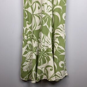 Hawaiian midi length dress featuring all over cream and sage monstera leaf print. Made in Hawaii of 100% rayon. Biased cut flared bottom ruffle.
