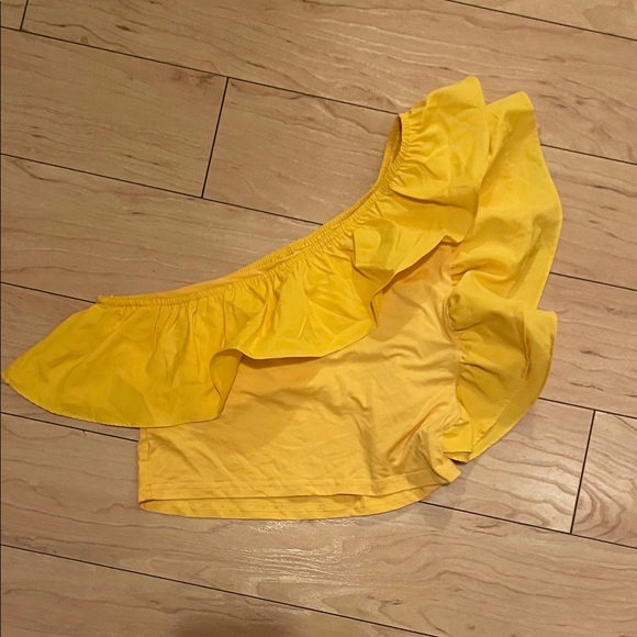 Stylish asymmetrical design with ruffled detail. Bright yellow color adds flair.