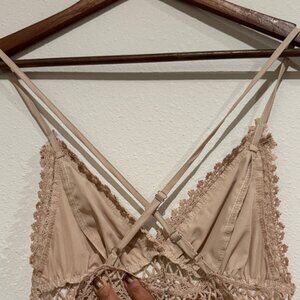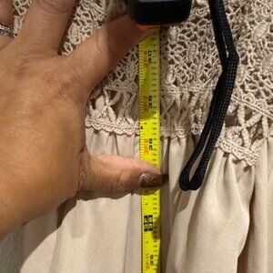 Chic beige maxi dress with lace trim. Perfect for elegant occasions. Flattering and stylish design.