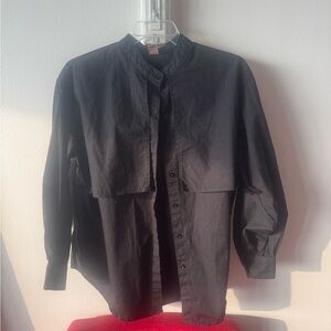 Chic black blouse. Button-up front. Long sleeves. Perfect for any occasion.