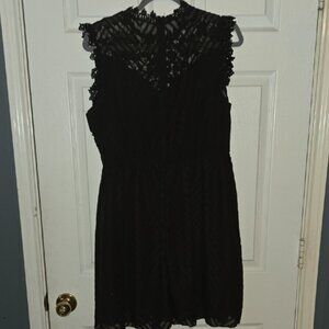 Chic black mini dress with lace overlay. Sleeveless design. Perfect for evening wear.