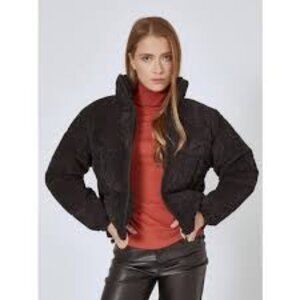 Stylish black puffer jacket. Features a high collar and zip closure. Perfect for cold weather.
