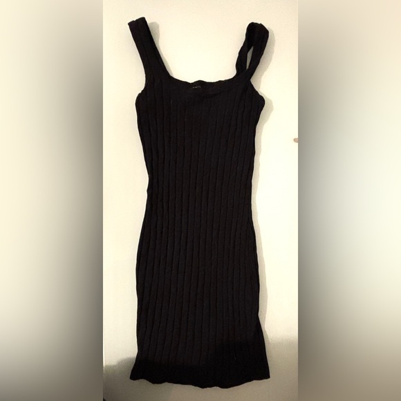 Elegant black ribbed dress. Sleeveless design. Perfect for any occasion.