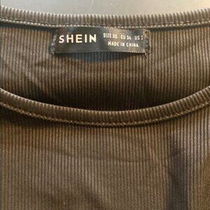 This stylish SHEIN crop top features a sleek black color and short sleeves, perfect for a modern, casual look. The top is designed with a cropped hemline, offering a trendy and comfortable fit. Made from a stretchy material, it ensures a flattering silhouette for any occasion.