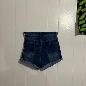 Trendy distressed jean shorts. Classic blue with ripped details. Perfect for casual wear.